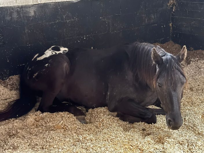 A black, (Ee aa) with one copy of the recessive red gene colt, he has Appaloosa characteristics (LP/lp) but did not inherit the PATN1 gene, therefore he’s a varnish roan and we cannot wait to see the changes occur overtime.