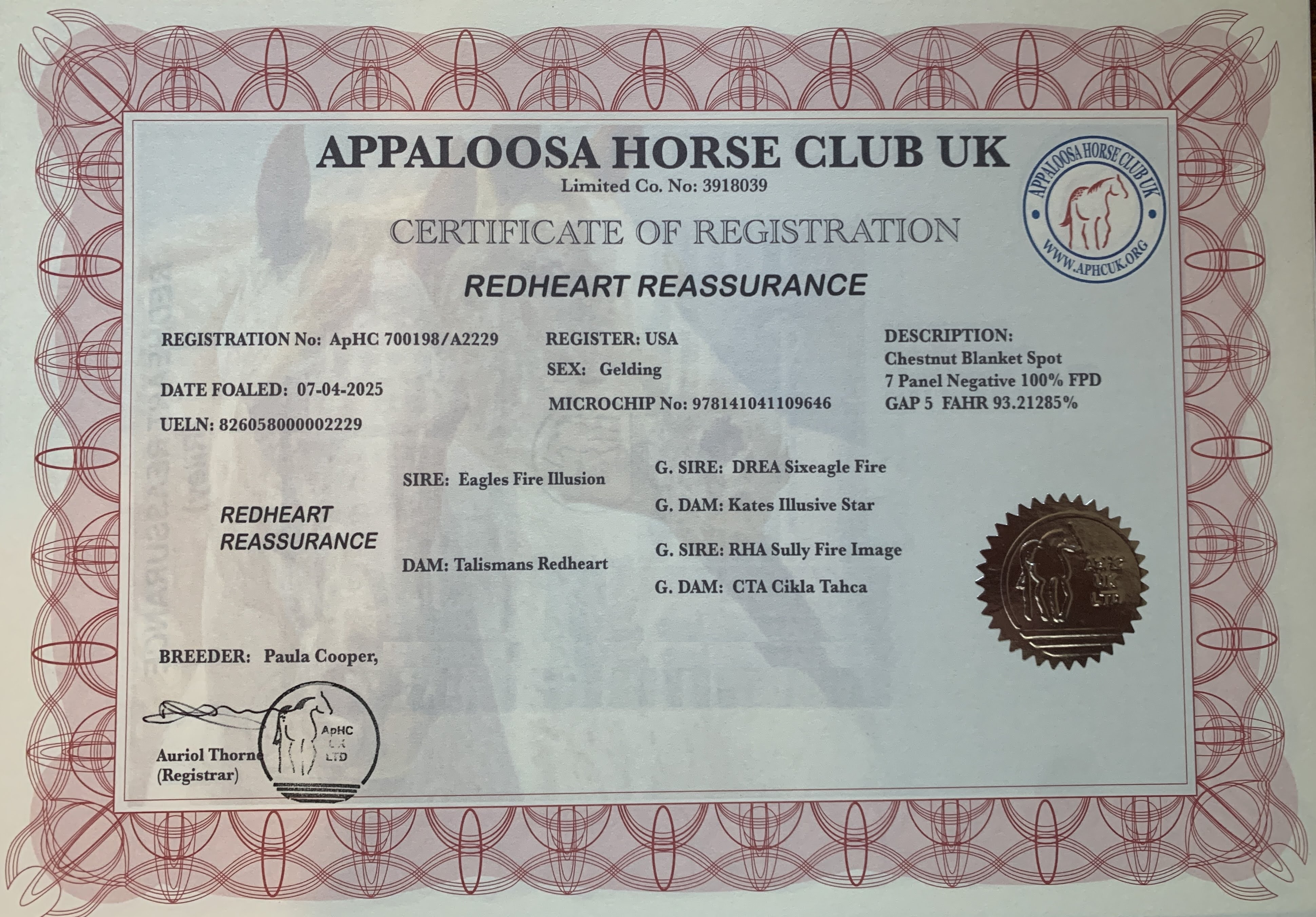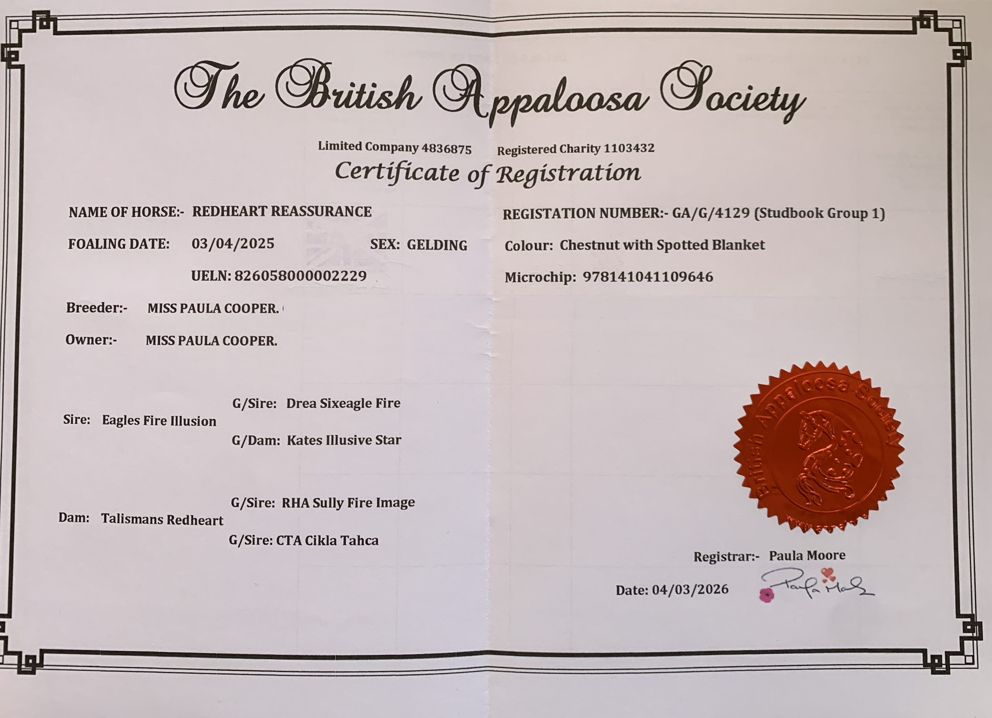 Registered with the Appaloosa Horse Club, the Appaloosa Horse UK, the British Appaloosa Society & the Foundation Appaloosa Horse Registry.
