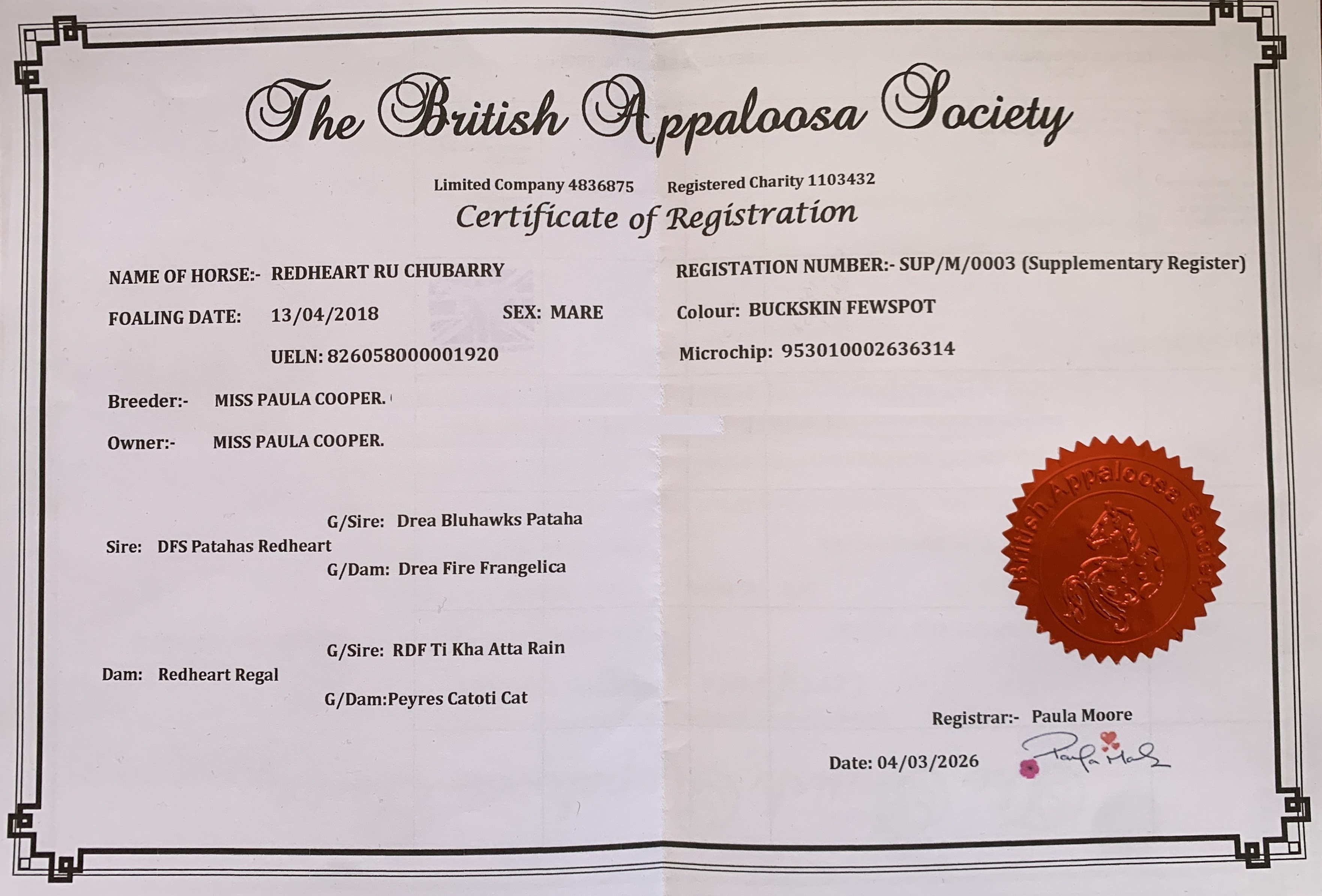 Registered with the Appaloosa Horse Club, enrolled in their Foundation Pedigree Designated programme at 100% FPD, “A” register with the Appaloosa Horse UK with a passport over-stamped by British Appaloosa Society as a Part Bred. Ru is registered with the Foundation Appaloosa Horse Registry, her foundation lines are traced back to the first 8 Stud Books of the ApHC at 79.7851%.